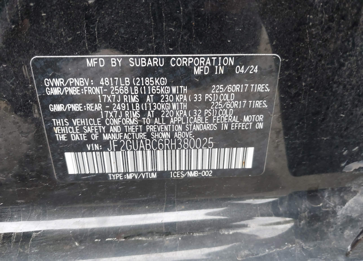 Each lot presented on our website contains complete information linked to the VIN code JF2GUABC6RH380025. This allows users to verify vehicle data, confirm ownership history, and find information about insurance claims and accidents. The 2024 Subaru Crosstrek with the specified VIN code is registered in a major American insurance auction system, which guarantees complete transparency and traceability of all information regarding its history.