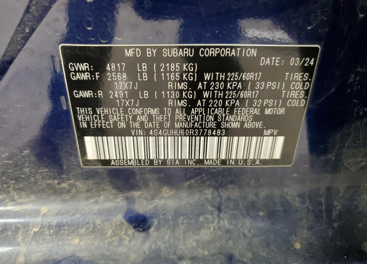Each lot presented on our website contains complete information linked to the VIN code 4S4GUHU60R3778483. This allows users to verify vehicle data, confirm ownership history, and find information about insurance claims and accidents. The 2024 Subaru Crosstrek with the specified VIN code is registered in a major American insurance auction system, which guarantees complete transparency and traceability of all information regarding its history.