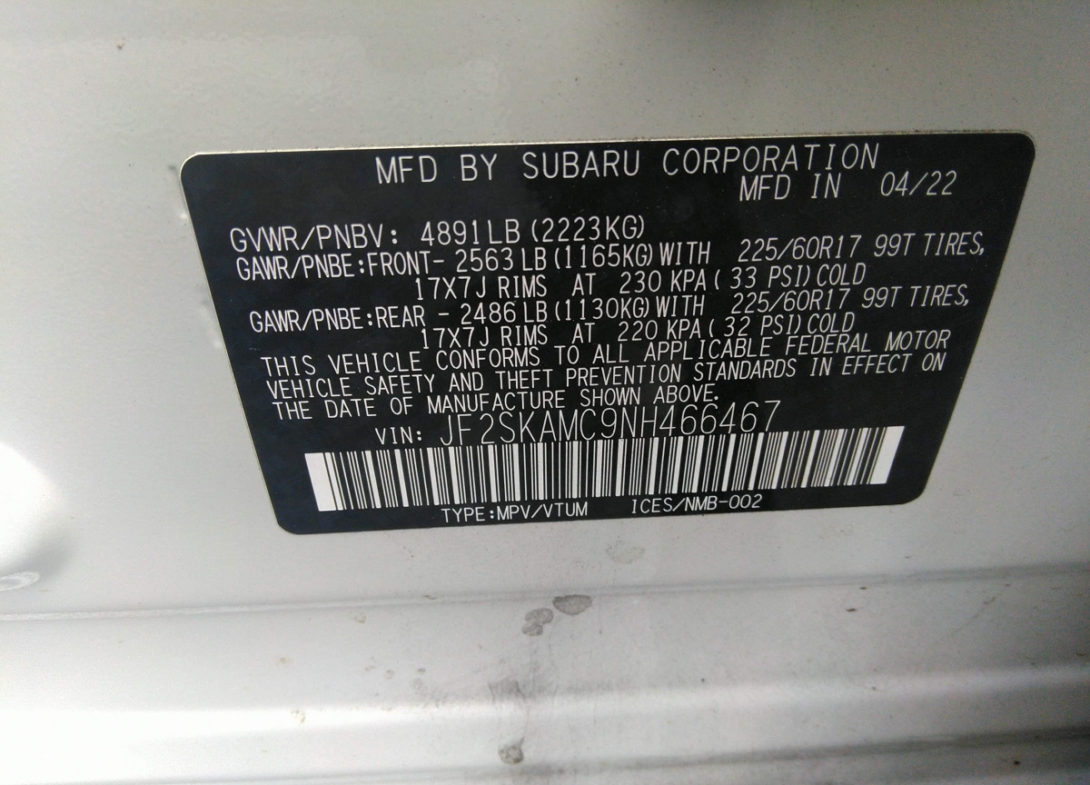 Each lot presented on our website contains complete information linked to the VIN code JF2SKAMC9NH466467. This allows users to verify vehicle data, confirm ownership history, and find information about insurance claims and accidents. The 2022 Subaru Forester with the specified VIN code is registered in a major American insurance auction system, which guarantees complete transparency and traceability of all information regarding its history.